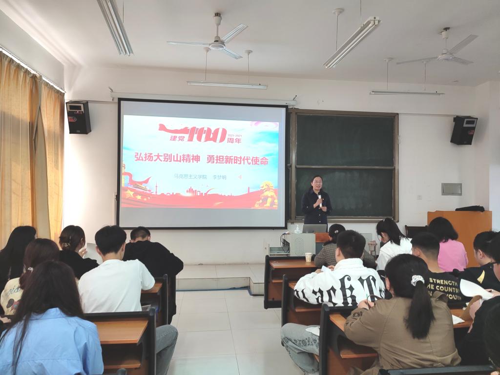 李梦明老师以“弘扬大别山精神,勇担新时代使命”为主题,以大别山区是中国共产党的重要建党基地,大别山精神是我们党的宝贵精神财富为开端,分别从大别山精神孕育、大别山精神的丰富内涵、大别山精神时代的价值、弘扬和传承大别山精神等四个方面进行了详细的解读。