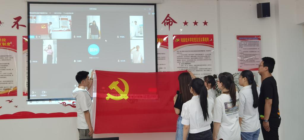 按照预备党员接收程序,经过正式党员无记名投票表决,决定孙奥等8名同志按期转正。党员教师任柯昱带领新转正学生面向党旗重温入党誓词。