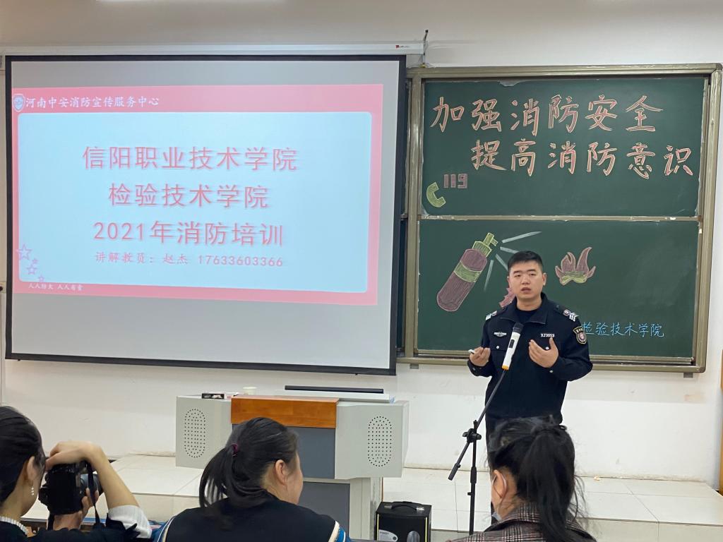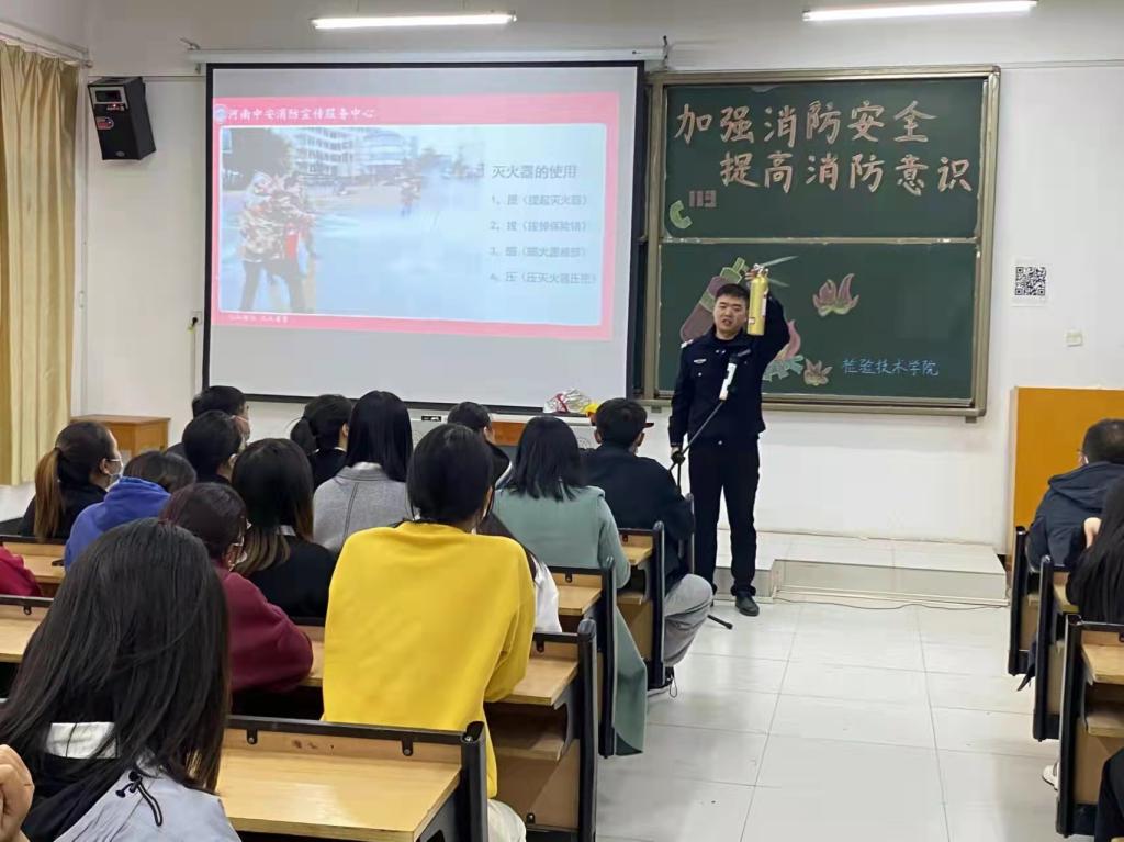 活动现场,河南省中安消防宣传中心赵杰主任教员,为买球官网师生进行消防安全知识培训,他详细讲解了关于消防安全四个能力方面的内容,列举了近期全国各地发生的一起起触目惊心的火灾事例,播放了火灾事故现场的相关视频,同时传授给师生火灾中自救逃生的基本技能。