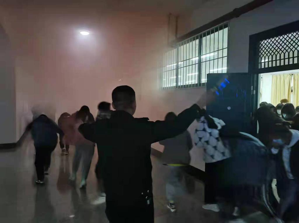 消防安全知识培训后,进行了消防安全紧急疏散演练。疏散警报一响,我们全院师生按照消防应急方案,迅速有序的撤离教室。走廊烟雾弥漫,师生们用手捂住口鼻,俯着身子快速地撤出了教学楼,用时一分四十秒。