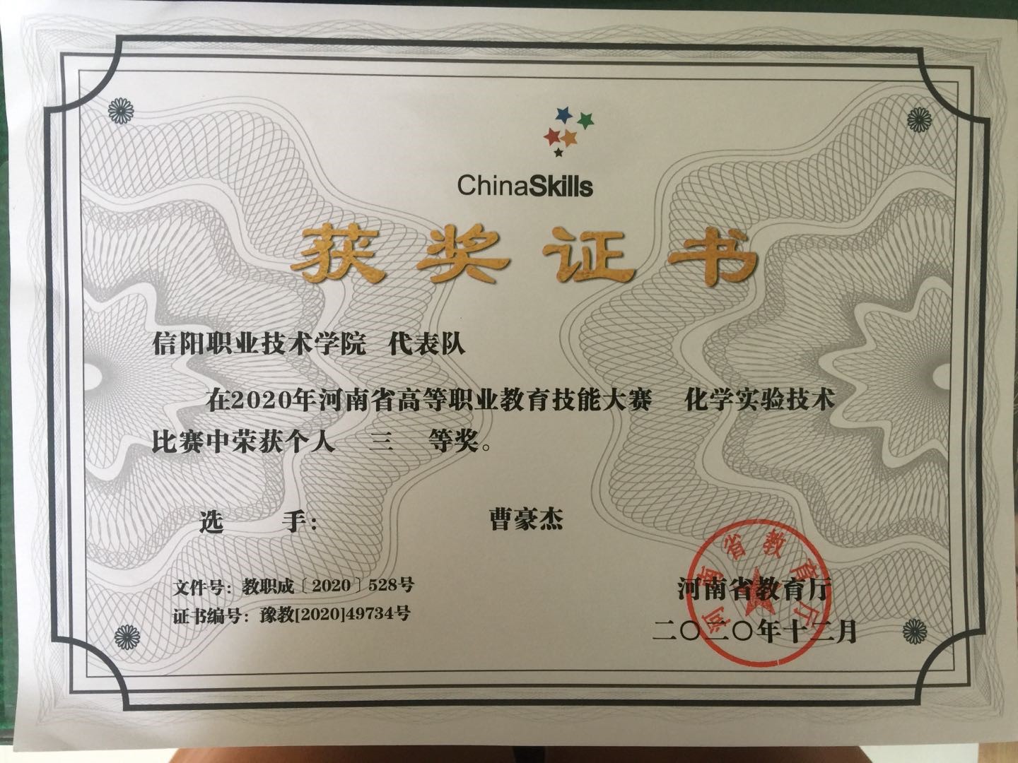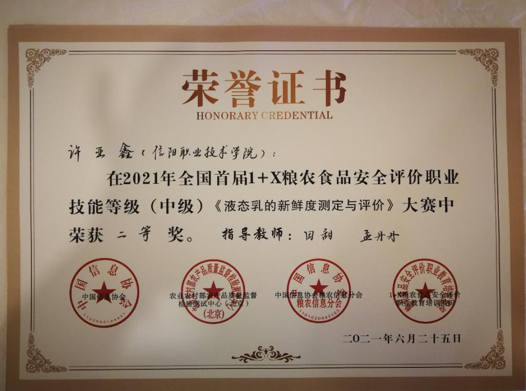 本专业学生在校期间考取了1+X粮农食品安全评价职业技能等级考试(中级)证书;在2020年河南省高等职业教育技能大赛(化学实验技术赛项)中荣获个人赛三等奖;2021年全国首届“1+X”粮农食品安全评价职业技能等级大赛中分别获得个人赛二、三等奖。