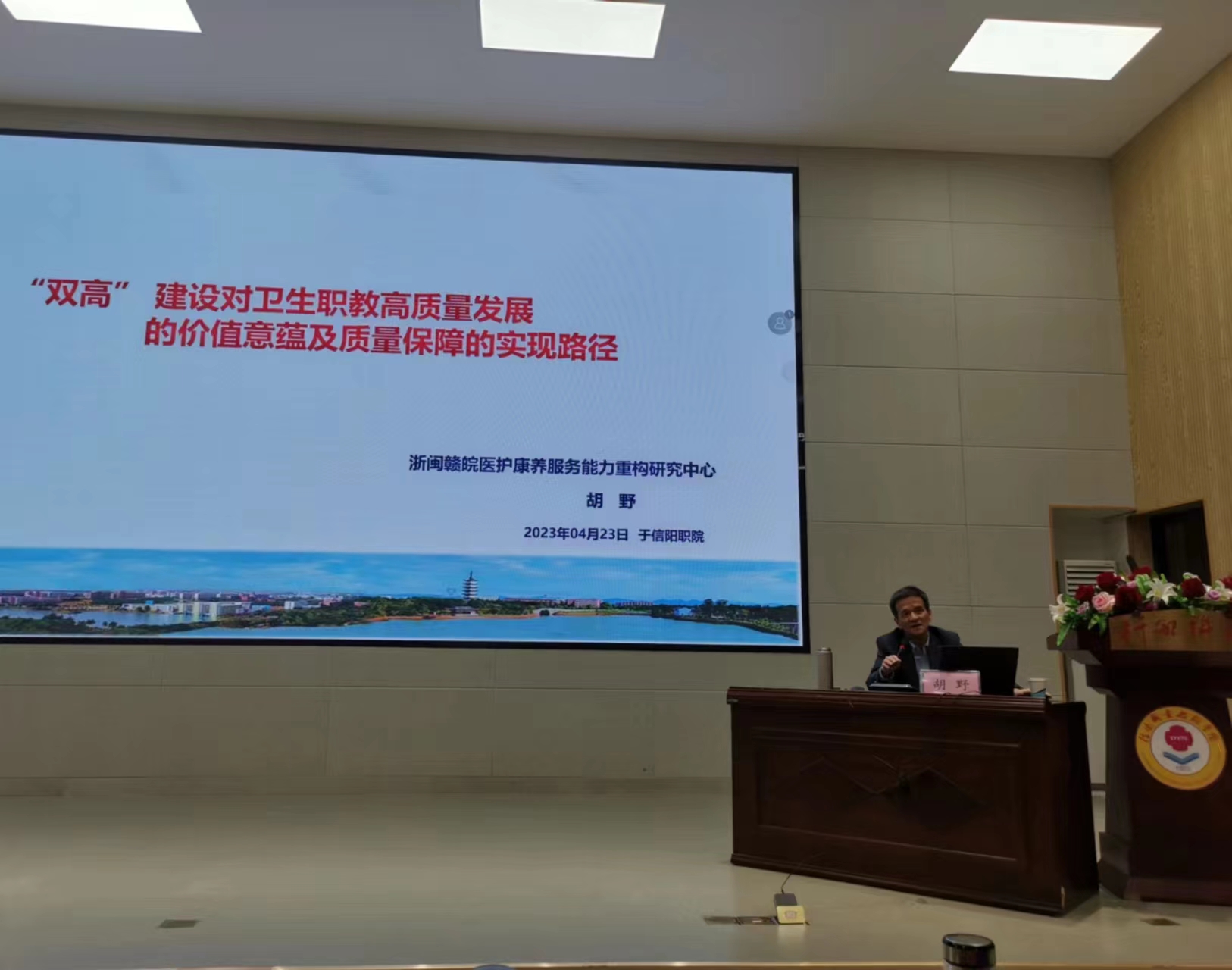 23日下午在行知讲堂举办河南省医药行业协会职业教育分会第四届学术交流会,学校党委书记郑洪涛,党委副书记、副校长王操志,党委委员、副校长李新毓参加相关活动。来自全省13所职业院校的70多名会员参加了会议。在交流会上胡野教授分别围绕“卫生健康类专业融合集群模式改革应然”、“融合集群模式在提升专业内涵中的价值”“高职教育教学改革提质培优成果有效性”、“职教‘双高’建设对专业提质培优作用”、“卫生健康专业群建设内部质保体系构建”作了题为《“双高” 建设对卫生职教高质量发展的价值意蕴及质量保障的实现路径》的专题讲座,并就相关问题进行了深入探讨和学术交流。