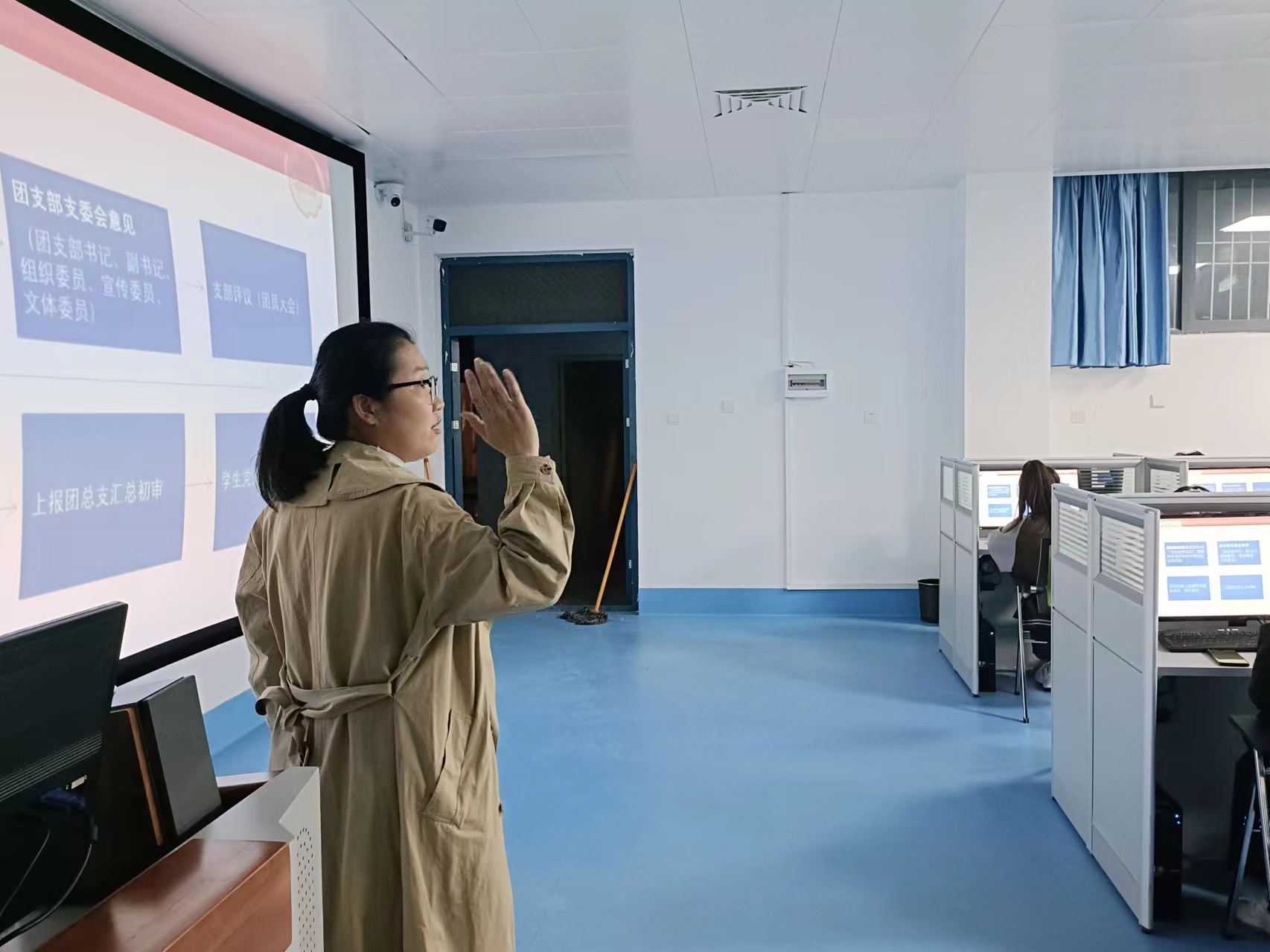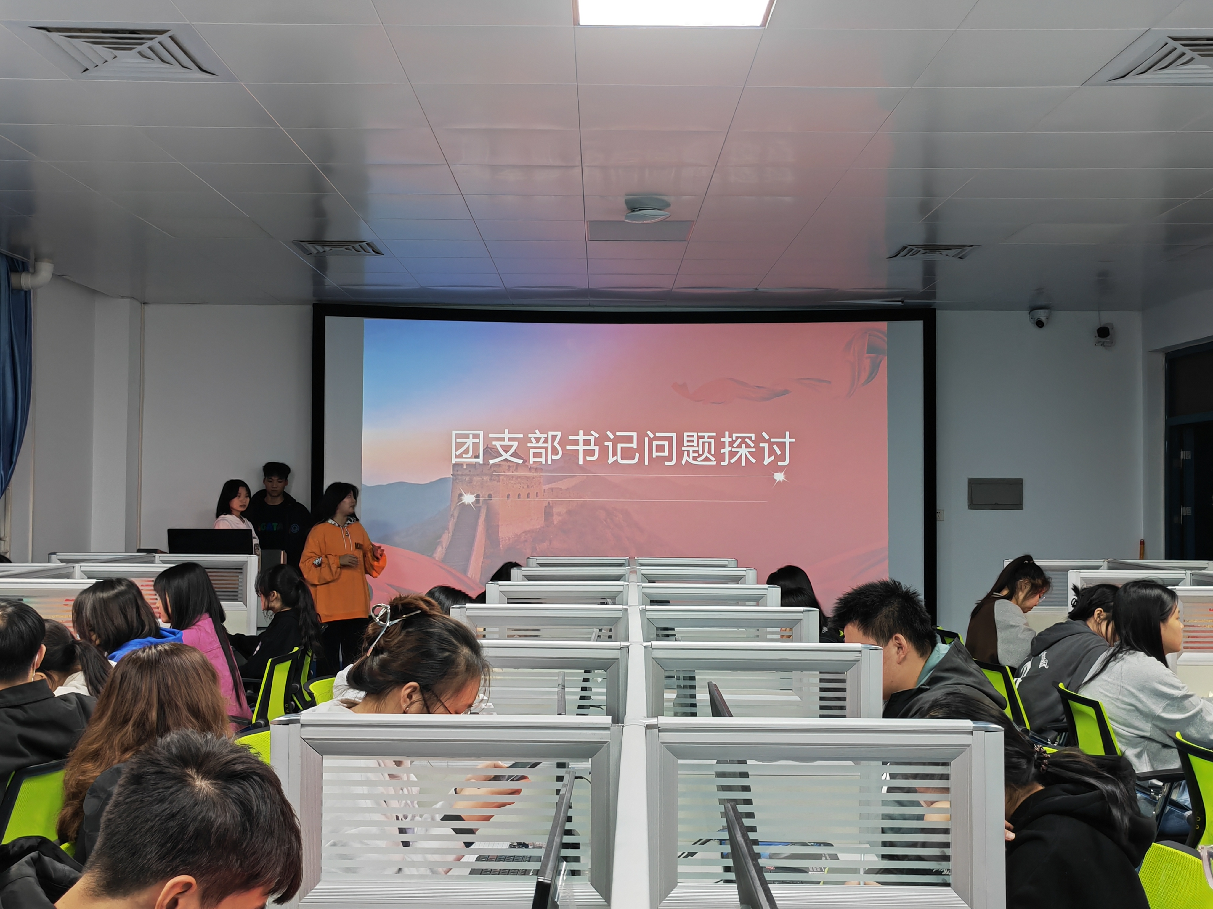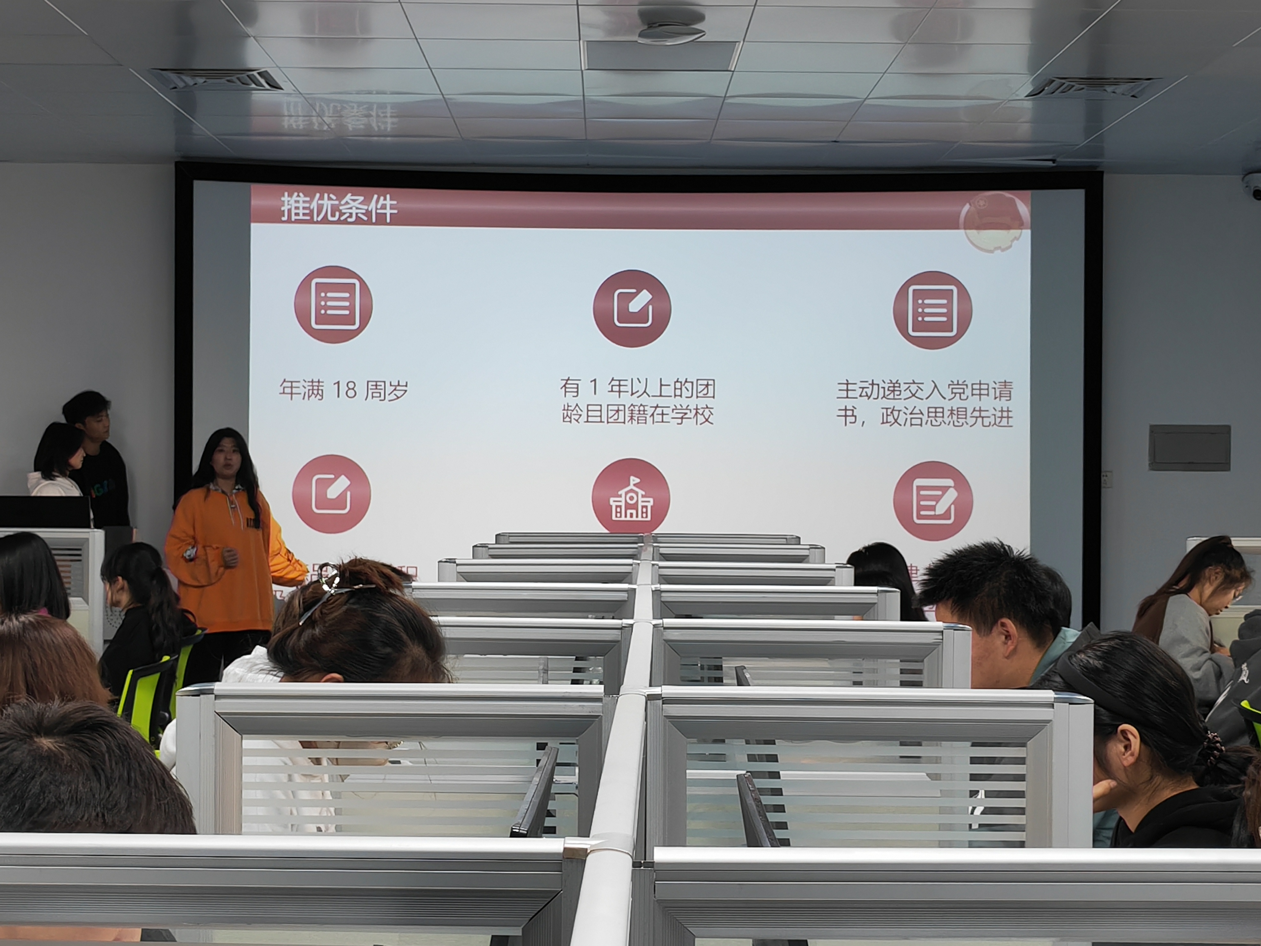 团总支组织委员刘一冰主要从推优的意义、推优的注意事项、推优的流程、《推优综合考评表》规范填写及相关支撑材料收集整理等四个方面进行讲解,团总支书记孟丹丹现场为各团支部答疑解惑,带领团干们明晰推优步骤,提升推优质量。