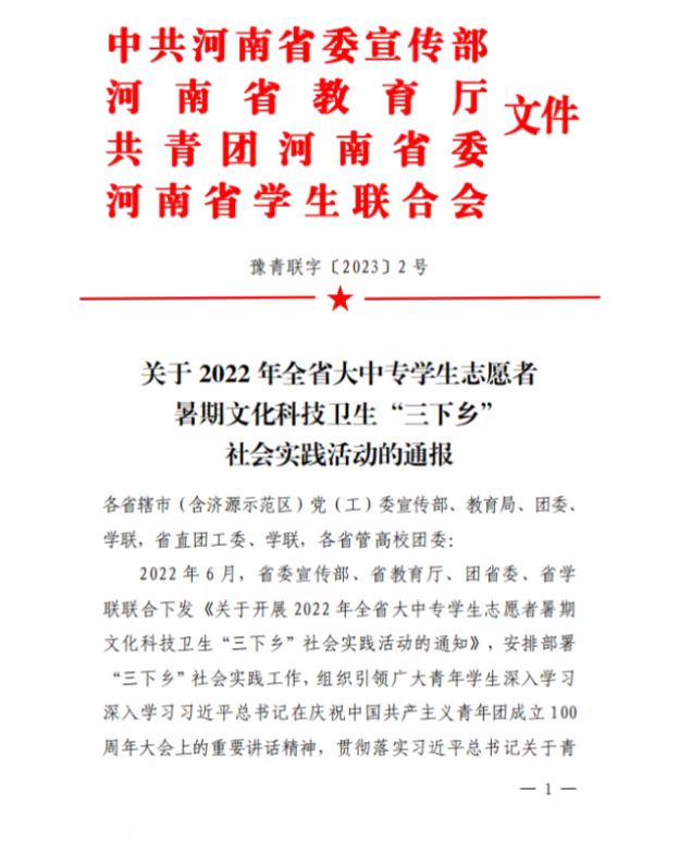 共青团河南省委办公室2023年1月17日印发《关于2022年全省大中专学生志愿者暑期文化科技卫生“三下乡”社会实践活动的通报》,其中通报表扬了100支省级“三下乡”社会实践优秀团队,买球官网“豫泰抗疫行动”实践调研团榜上有名!