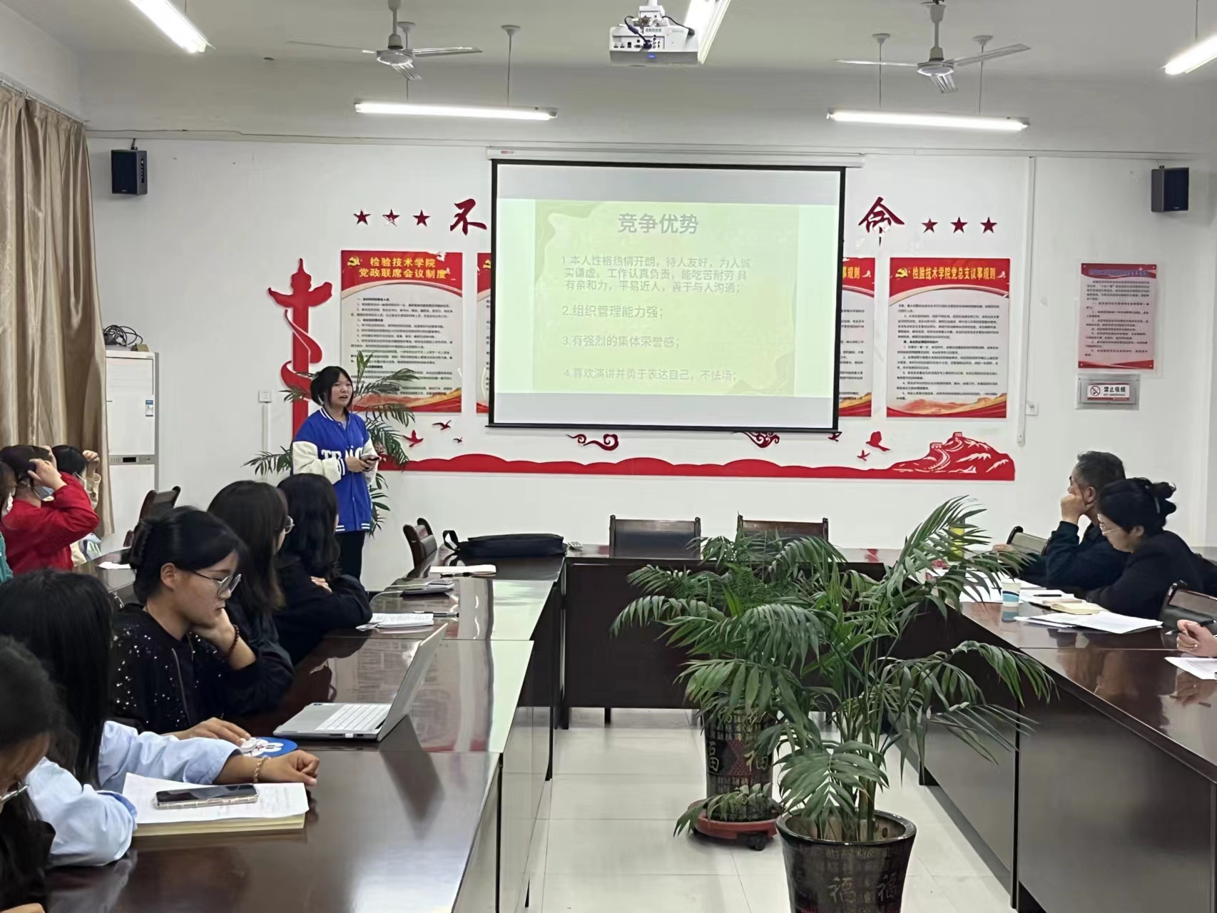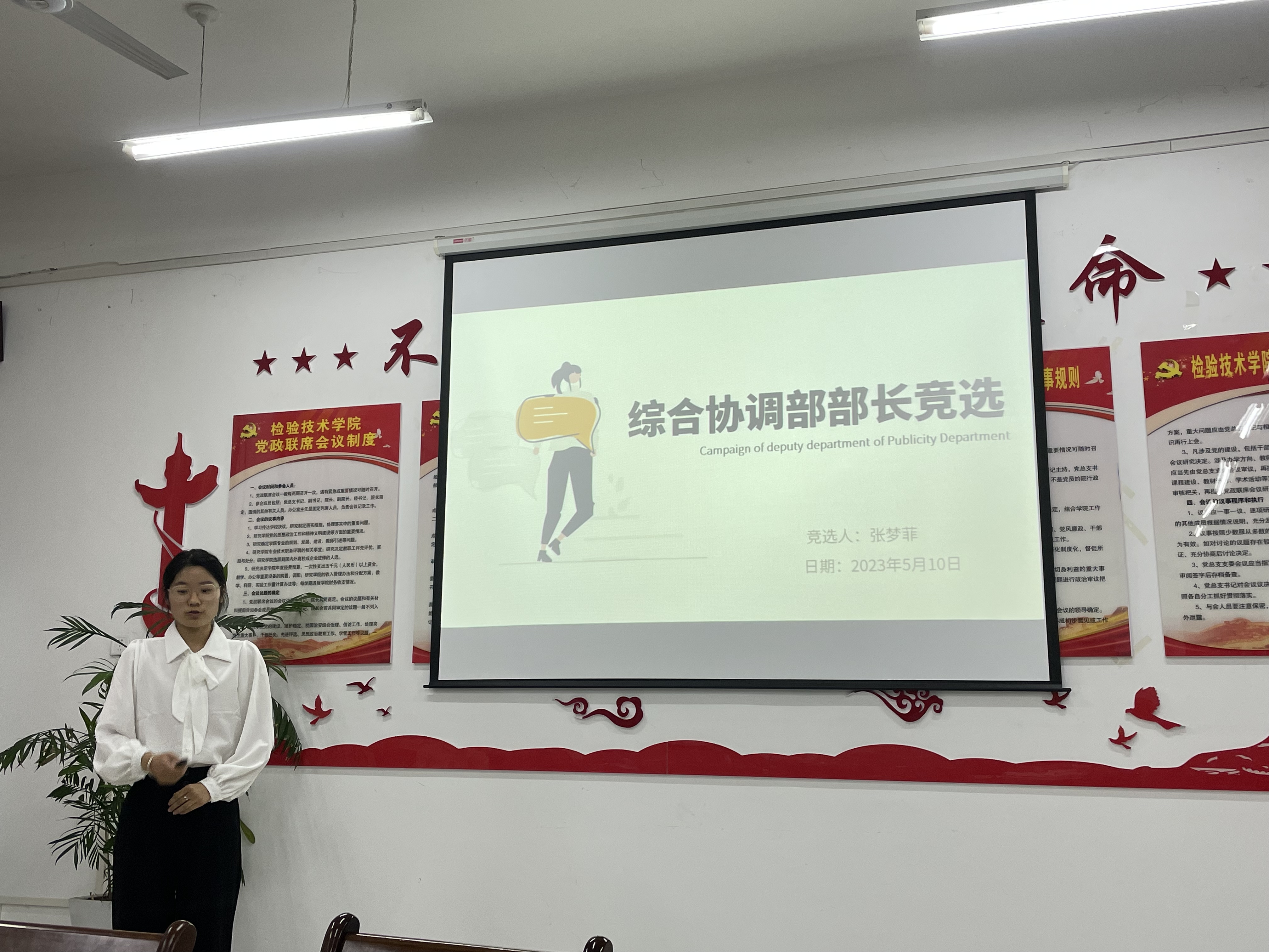 学生会执行主席刘莎莎做工作报告,各竞聘人员根据竞聘通知要求,结合ppt进行演讲,团总支书记孟丹丹肯定了上届学生会成绩,对新一届学生会提出了更高希望。