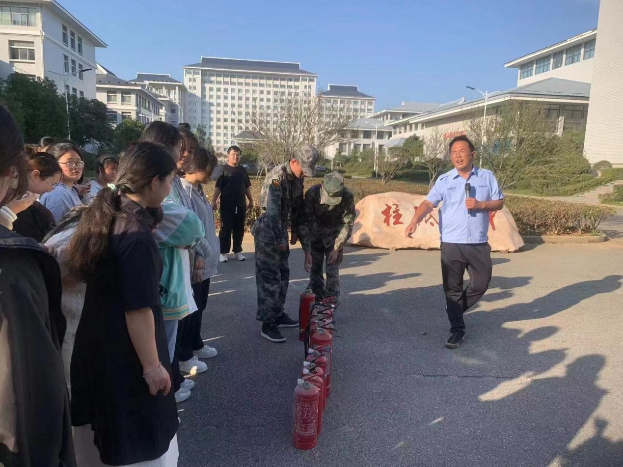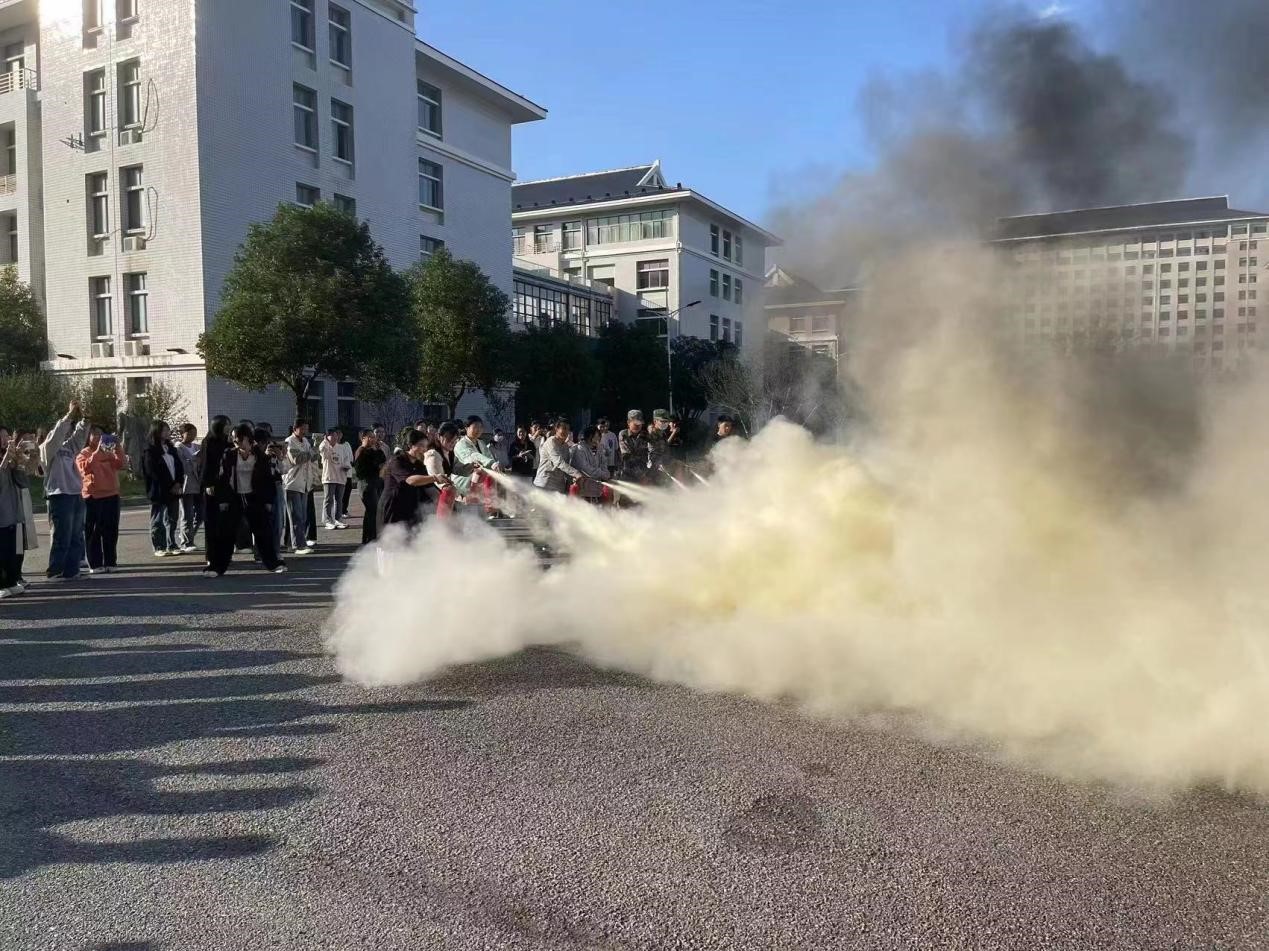 在教学楼附近空旷场地,吴科长现场演示了灭火器的使用方法、使用距离、使用角度等,还讲述了灭火器的一些注意事项。在场的学生积极进行实际操作,真正在实践中掌握灭火技能。