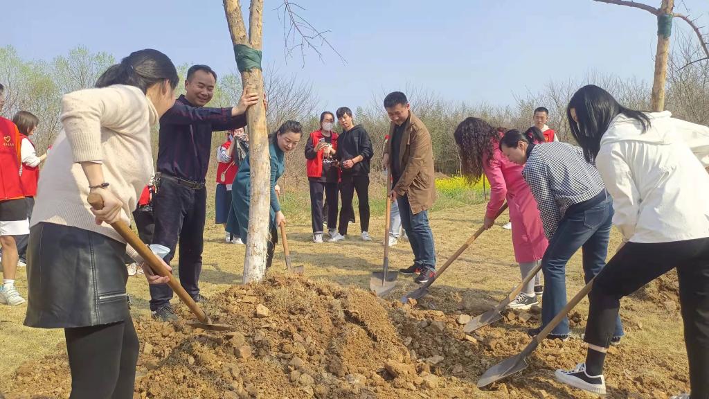 大家齐心协力,撸起袖子加油干,挥舞铁锹翻新土,扶植新苗列成行。一棵棵树苗的栽下,象征着一份份绿色的希望;每一滴汗水的流下、每一铲泥土的填充,代表着每一个人的奉献与关爱。这一片生命的绿色将赋予大地新的生机,带来清新的空气。