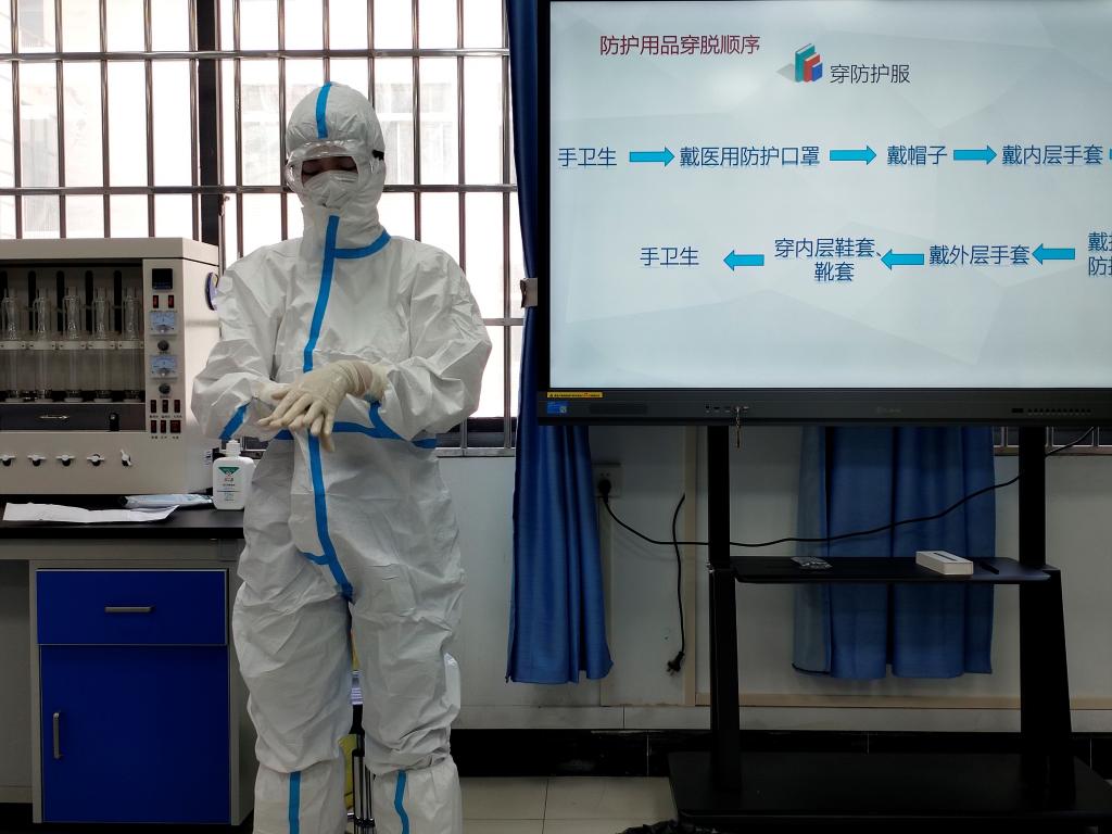 随后宋镜南和谢诗雅两位老师现场进行防护服穿脱规范操作示范,并随机抽取培训人员进行操作,对不规范的动作及时加以纠正。同时提醒实训中心要妥善保存防护用品,并定期对其安全性进行检查。讲解过程生动有趣,互动性强,深受大家好评。